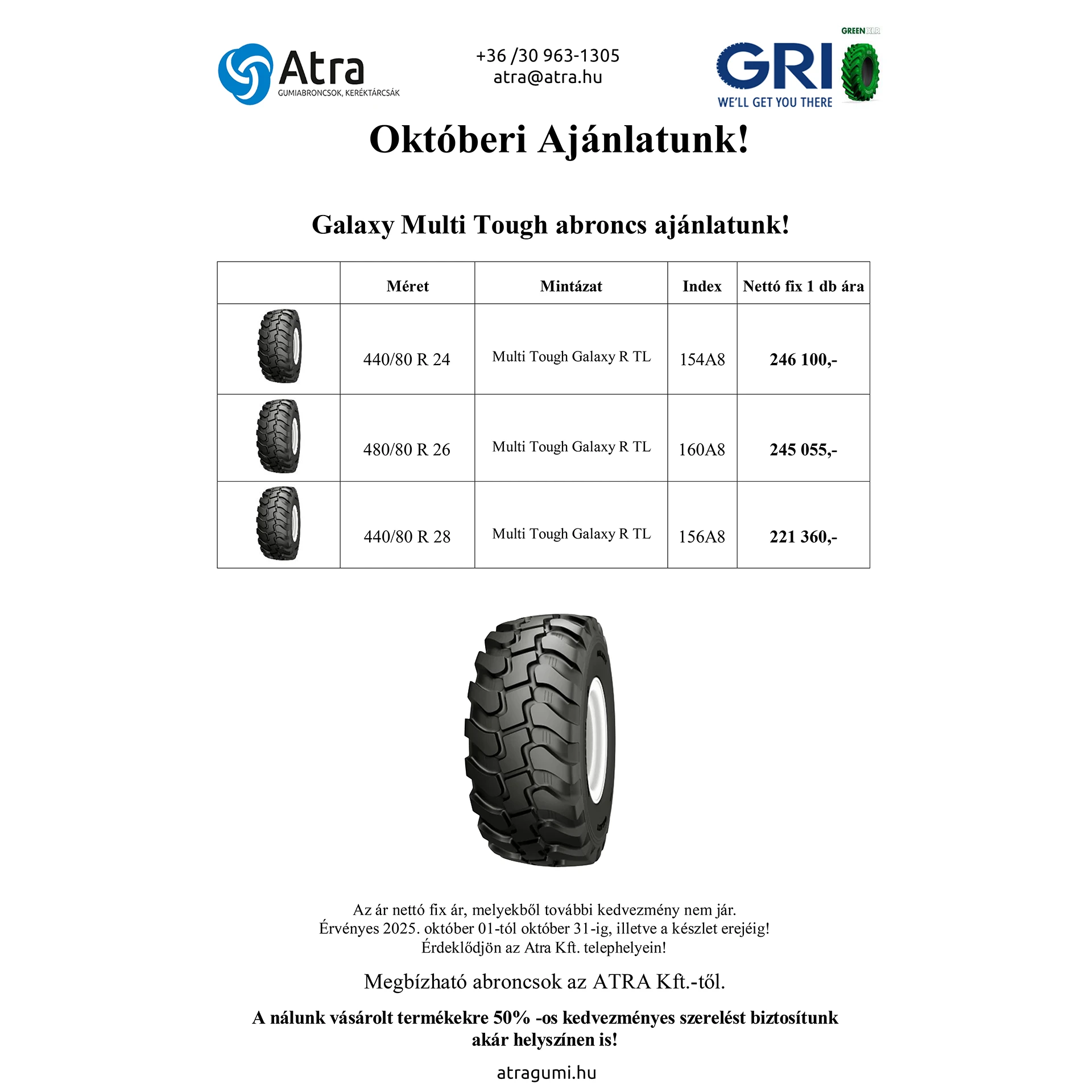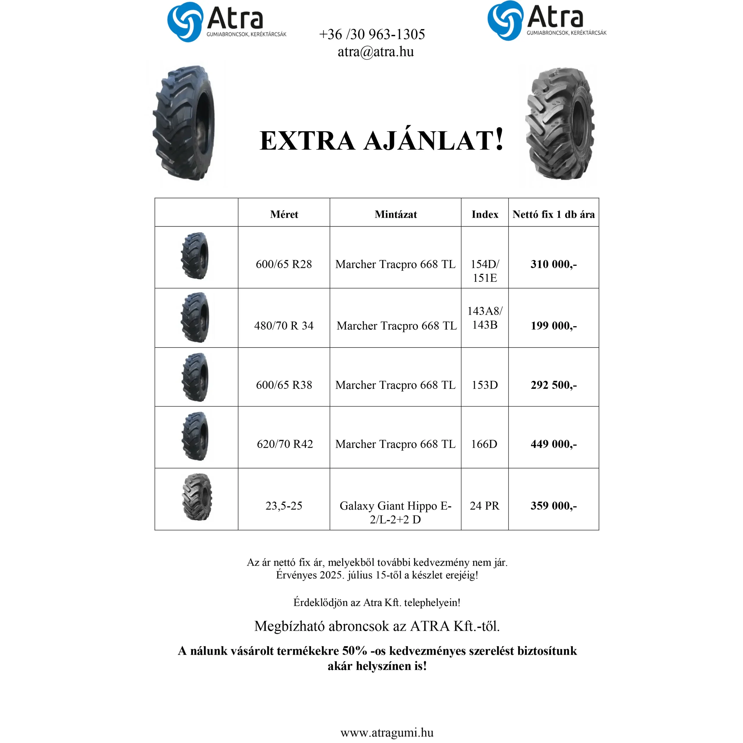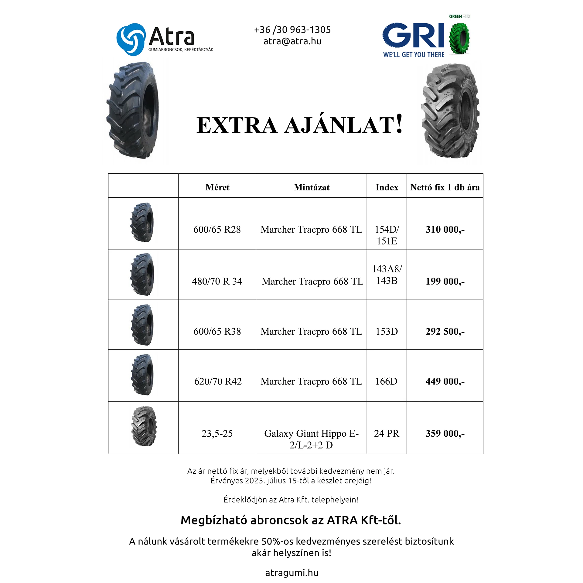 Folyamatosan, nagy választékban azonnal raktárról, vagy közvetlenül a gumiabroncs gyárból rendelésre! Kiszállítást biztosítunk az ország egész területére, a raktáron lévő ipari/építőipari/mezőgazdasági gumiabroncsokat akár 24-48 órán belül kiszállítjuk, vagy átvehető 8 telephelyünk valamelyikén. Továbbképzett technikai és gumiszerelő kollégákkal, valamint versenyképes árakkal várunk minden erőgép és munkagép üzemeltetőt.