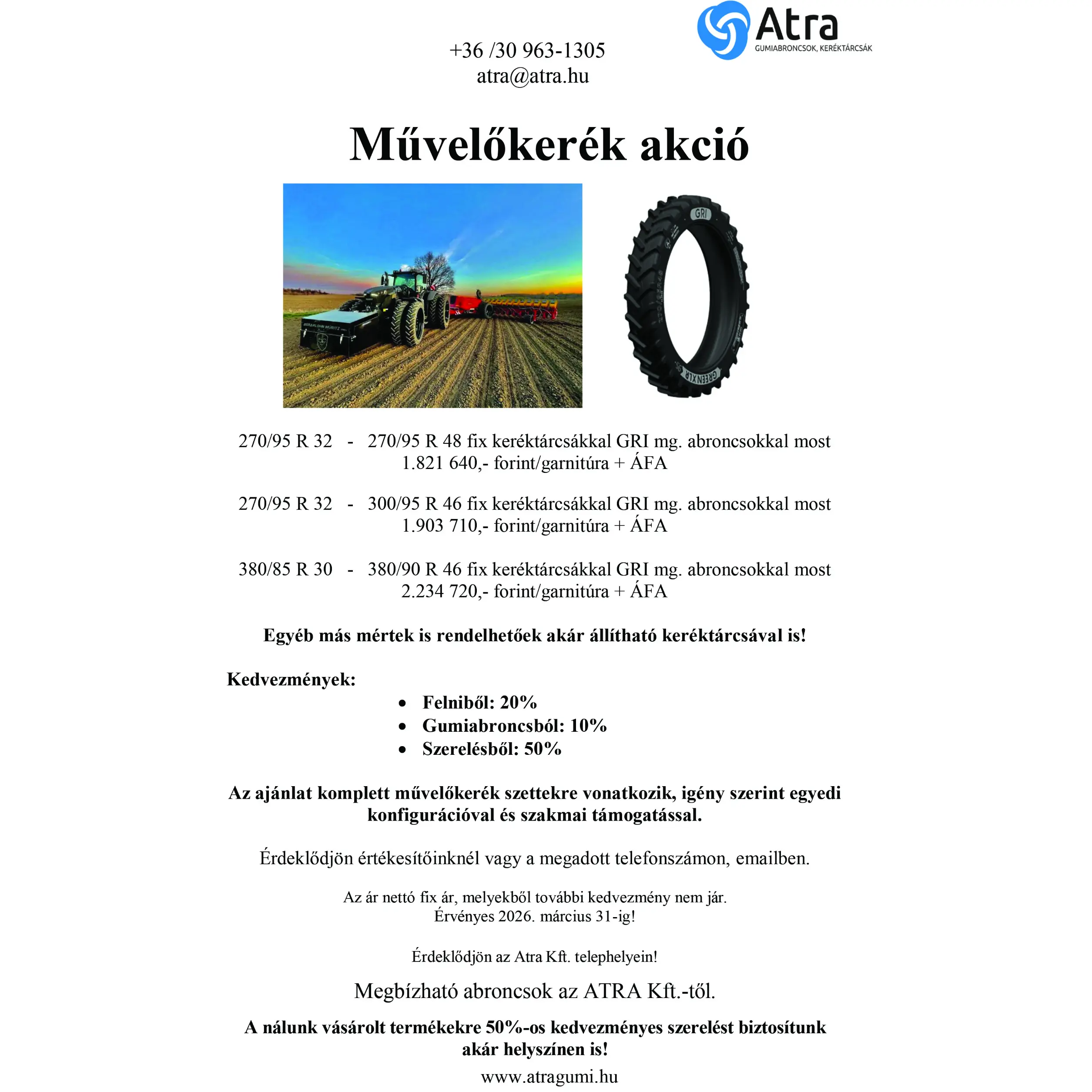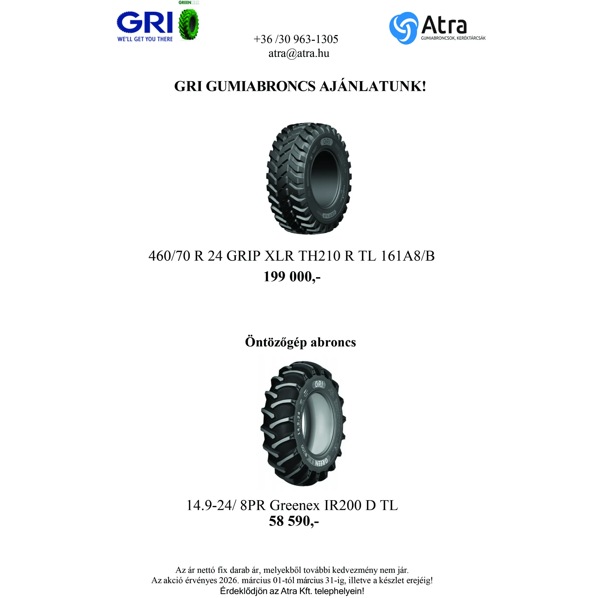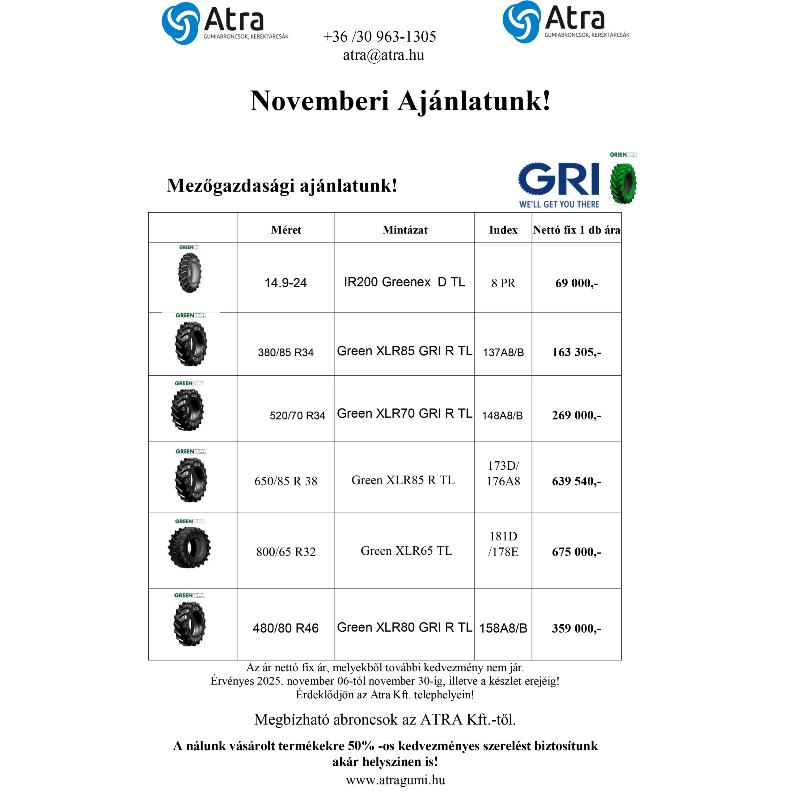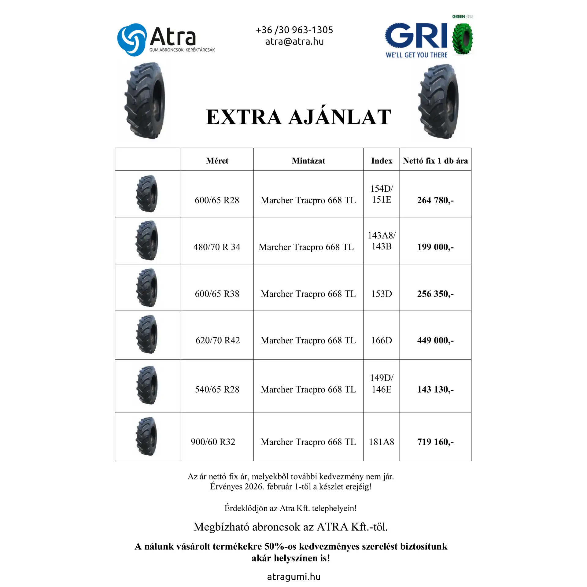Folyamatosan, nagy választékban azonnal raktárról, vagy közvetlenül a gumiabroncs gyárból rendelésre! Kiszállítást biztosítunk az ország egész területére, a raktáron lévő ipari/építőipari/mezőgazdasági gumiabroncsokat akár 24-48 órán belül kiszállítjuk, vagy átvehető 8 telephelyünk valamelyikén. Továbbképzett technikai és gumiszerelő kollégákkal, valamint versenyképes árakkal várunk minden erőgép és munkagép üzemeltetőt.